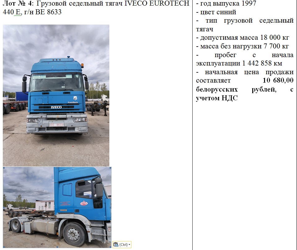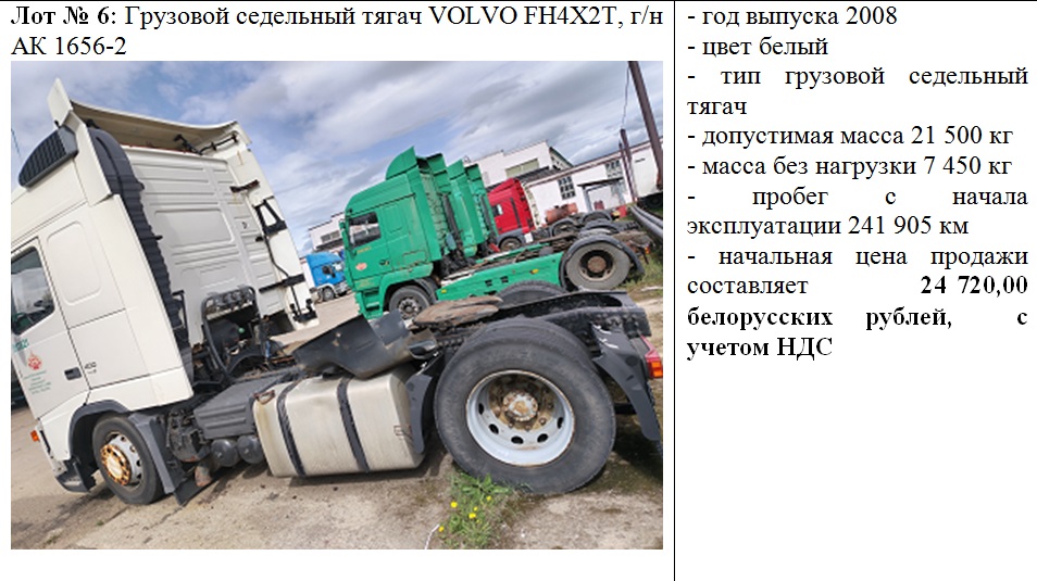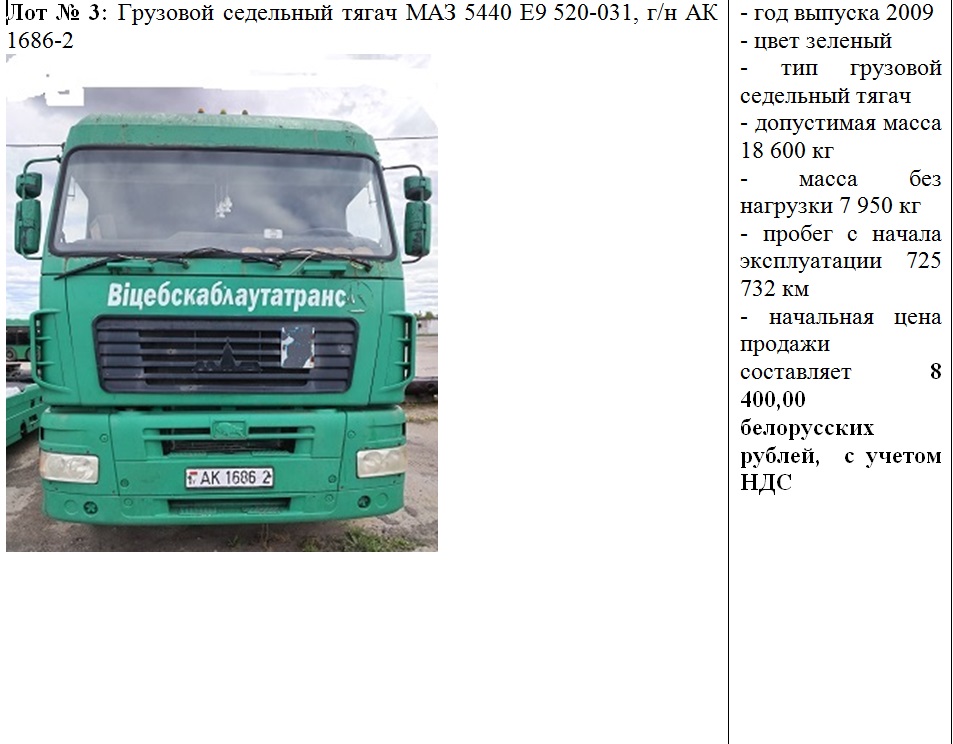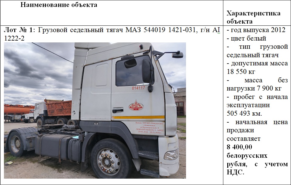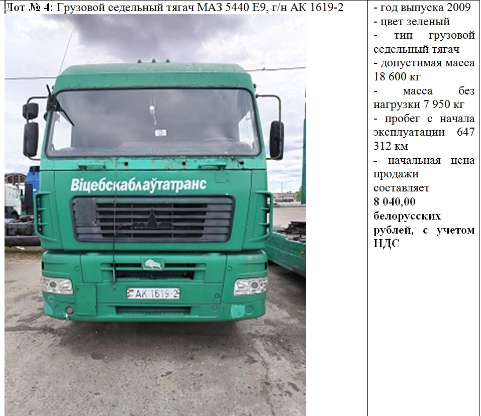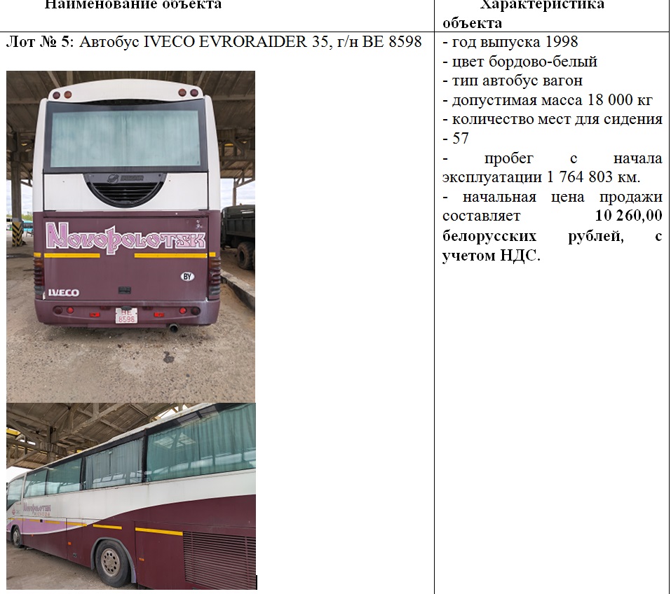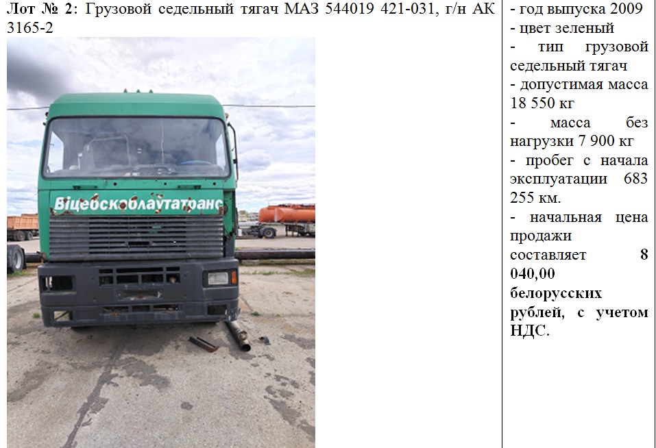 5 июня 2025 г. в 12.30 состоится повторный открытый аукцион по продаже транспортных средств, с понижением начальной цена на 20%, принадлежащих Филиалу «АТП № 6 г. Новополоцка» ОАО «Витебскоблавтотранс».